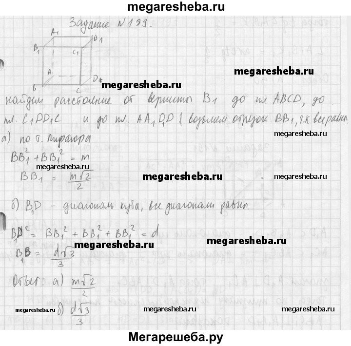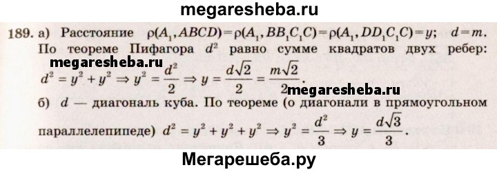 189. Найдите расстояние от вершины куба до плоскости любой грани, в которой не лежит эта вершина, если: а) диагональ грани куба равна m; б) диагональ куба равна d.
