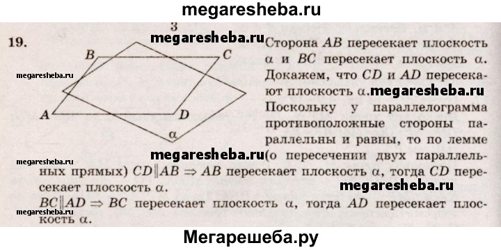 19. Стороны АВ и ВС параллелограмма ABCD пересекают плоскость α. Докажите, что прямые AD и DC также пересекают плоскость α.