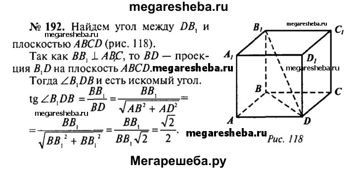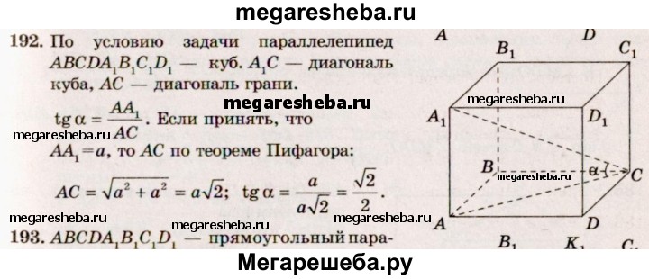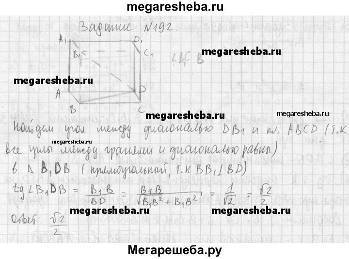 192. Найдите тангенс угла между диагональю куба и плоскостью одной из его граней.