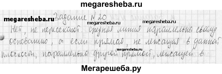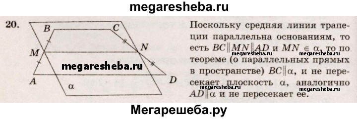 20. Средняя линия трапеции лежит в плоскости α. Пересекают ли прямые, содержащие ее основания, плоскость α? Ответ обоснуйте.