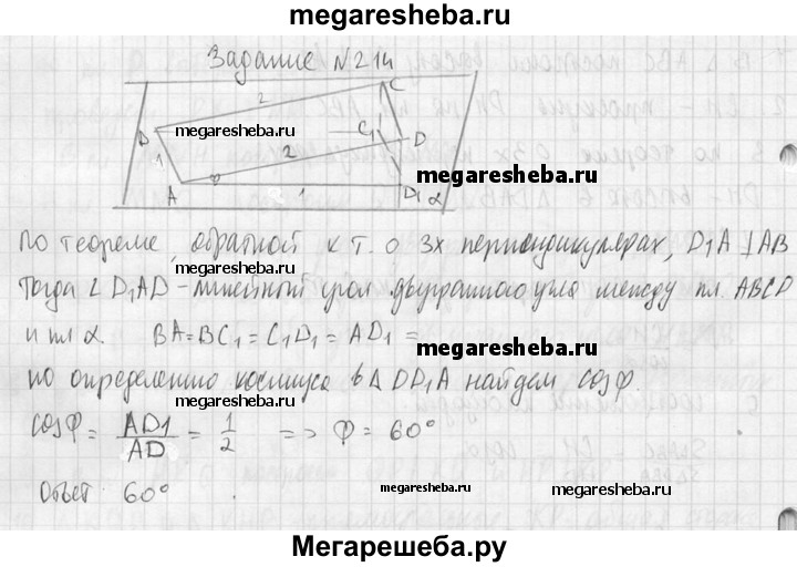 214. Проекцией прямоугольника ABCD на плоскость α является квадрат ABC1D1. Вычислите угол ф между плоскостью α и плоскостью прямоугольника ABCD, если АВ:ВС =1:2.