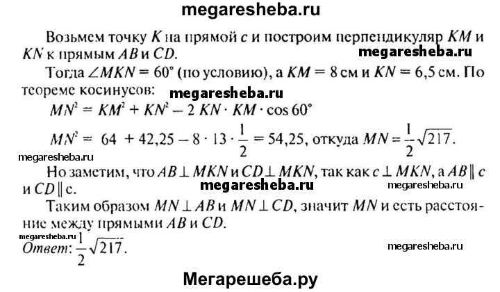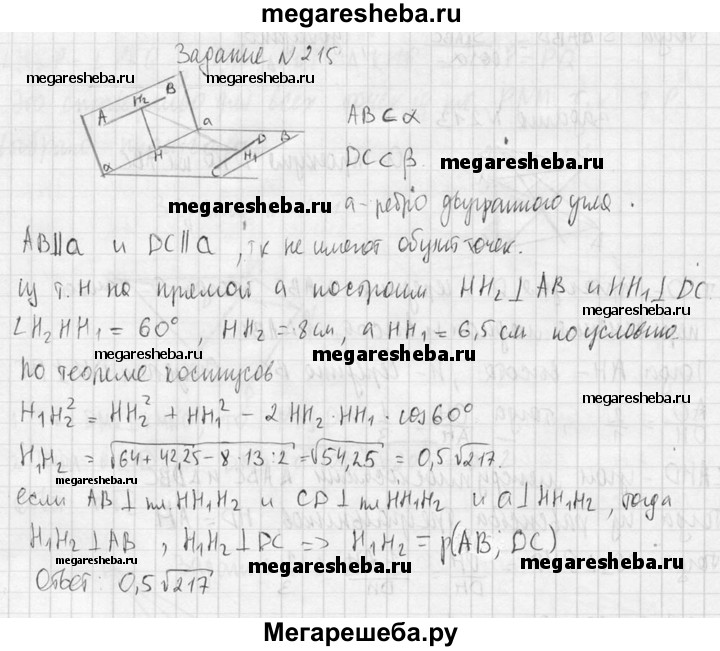 215. Параллельные прямые АВ и CD лежат в разных гранях двугранного угла, равного 60°. Точки А и D удалены от ребра двугранного угла соответственно на 8 см и 6,5 см. Найдите расстояние между прямыми АВ и CD.
