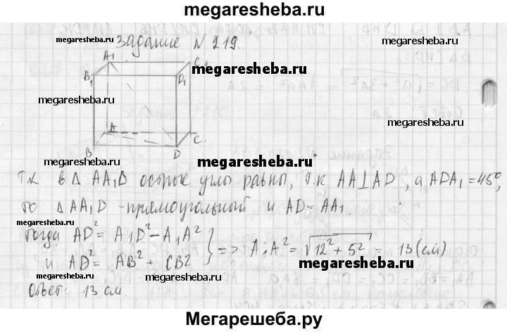 219. В прямоугольном параллелепипеде стороны основания равны 12 см и 5 см. Диагональ параллелепипеда образует с плоскостью основания угол в 45°. Найдите боковое ребро параллелепипеда.