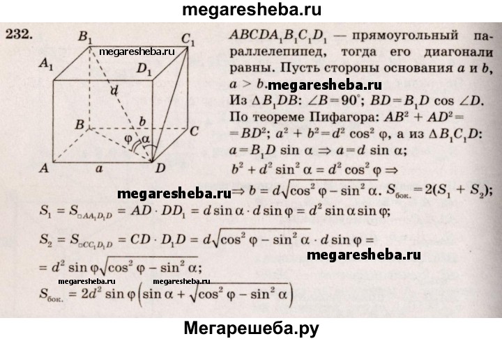 232. Диагональ прямоугольного параллелепипеда, равная d, образует с плоскостью основания угол ф, а с одной из боковых граней — угол α. Найдите площадь боковой поверхности параллелепипеда.