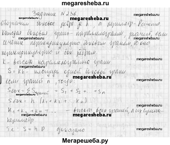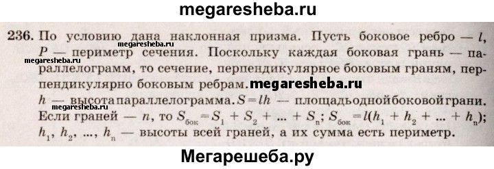 236. Докажите, что площадь боковой поверхности наклонной призмы равна произведению периметра перпендикулярного сечения на боковое ребро.