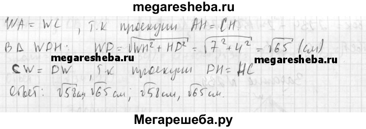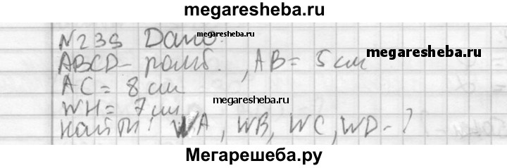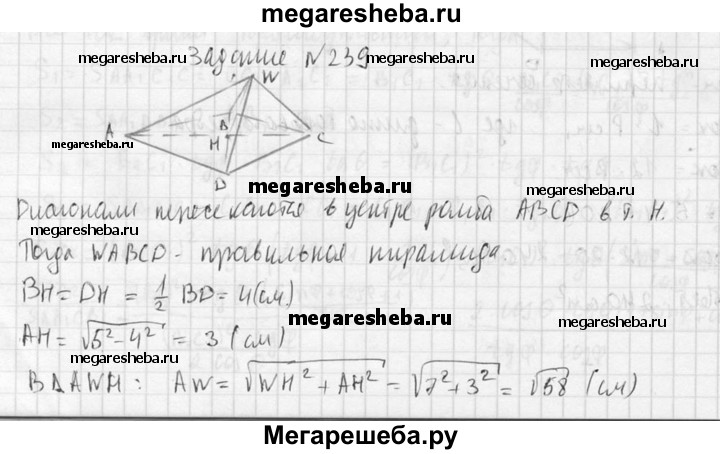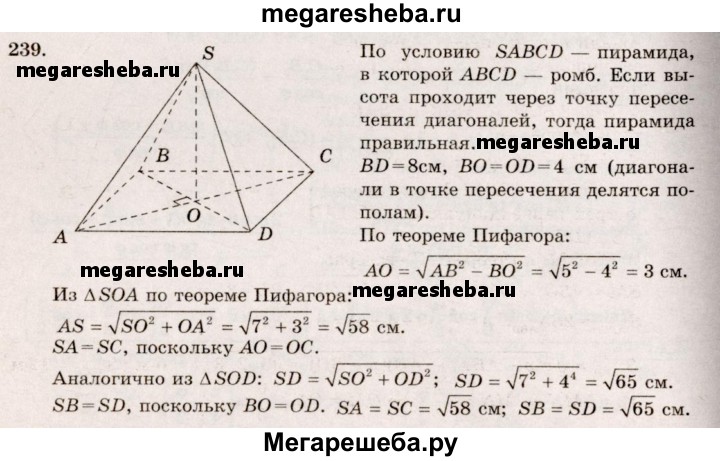 239. Основанием пирамиды является ромб, сторона которого равна 5 см, а одна из диагоналей равна 8 см. Найдите боковые ребра пирамиды, если высота ее проходит через точку пересечения диагоналей основания и равна 7 см.