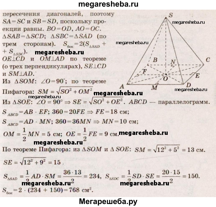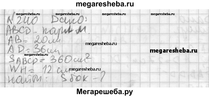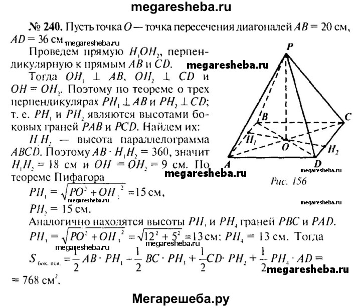 240. Основанием пирамиды является параллелограмм, стороны которого равны 20 см и 36 см, а площадь равна 360 см². Высота пирамиды проходит через точку пересечения диагоналей основания и равна 12 см. Найдите площадь боковой поверхности пирамиды.