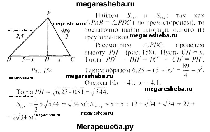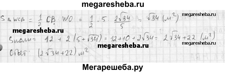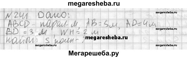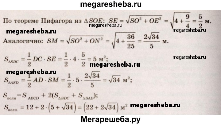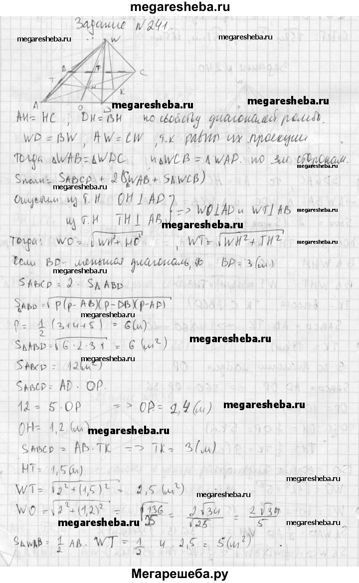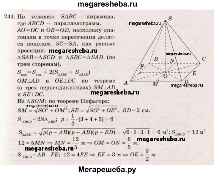 241. Основанием пирамиды является параллелограмм со сторонами 5 м и 4 м и меньшей диагональю 3 м. Высота пирамиды проходит через точку пересечения диагоналей основания и равна 2 м. Найдите площадь полной поверхности пирамиды.