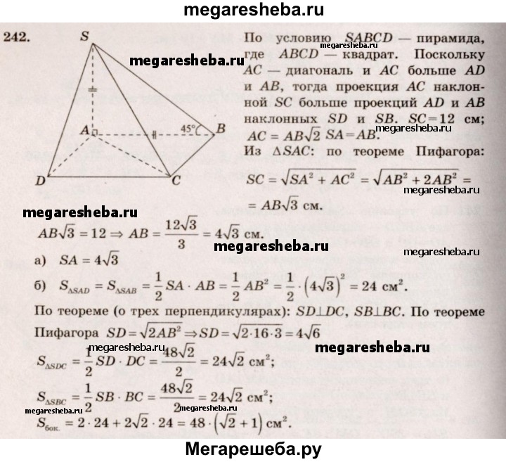 242. Основанием пирамиды является квадрат, одно из боковых ребер перпендикулярно к плоскости основания. Плоскость боковой грани, не проходящей через высоту пирамиды, наклонена к плоскости основания под углом 45°. Наибольшее боковое ребро равно 12 см. Найдите: а) высоту пирамиды; б) площадь боковой поверхности пирамиды.
