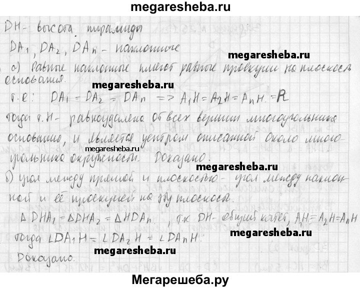 249. В пирамиде все боковые ребра равны между собой. Докажите, что: а) высота пирамиды проходит через центр окружности, описанной около основания; б) все боковые ребра пирамиды составляют равные углы с плоскостью основания.