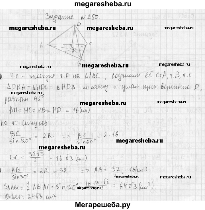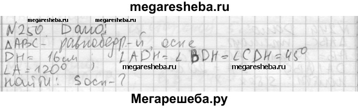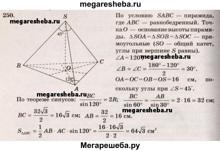250. Основанием пирамиды является равнобедренный треугольник с углом 120°. Боковые ребра образуют с ее высотой, равной 16 см, углы в 45°. Найдите площадь основания пирамиды..