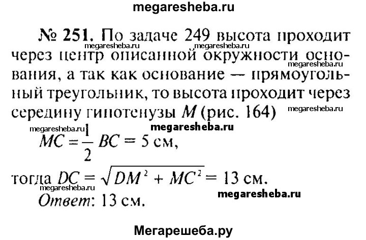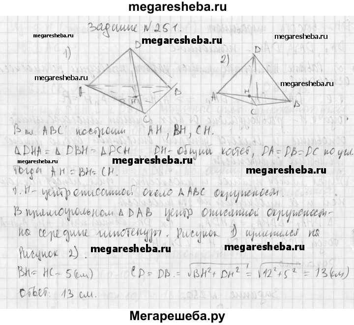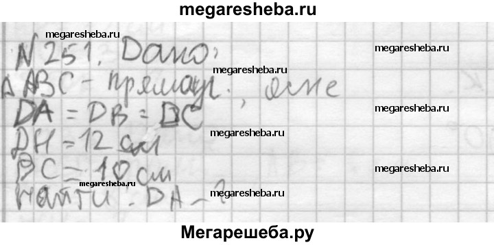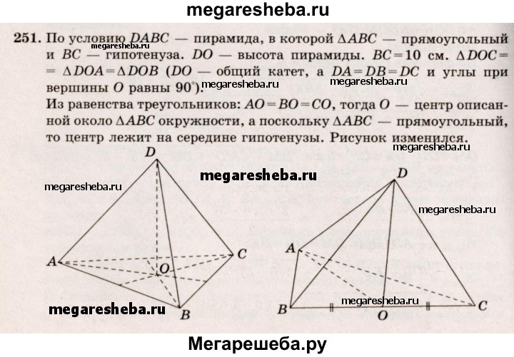 251. Основанием пирамиды DABC является прямоугольный треугольник с гипотенузой ВС. Боковые ребра пирамиды равны друг другу, а ее высота равна 12 см. Найдите боковое ребро пирамиды, если ВС = 10 см
