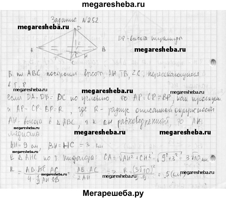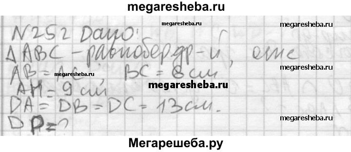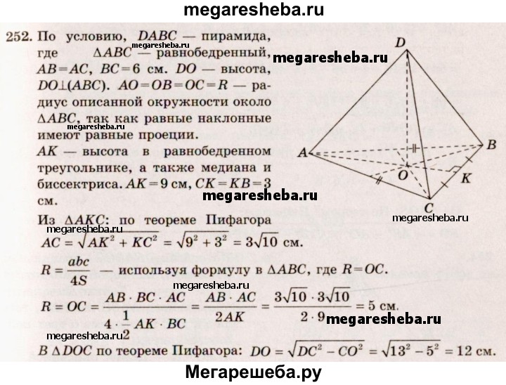 252. Основанием пирамиды DABC является равнобедренный треугольник ABC, в котором стороны АВ и АС равны, ВС = 6 см, высота АН равна 9 см. Известно также, что DA = DB = DC =13 см. Найдите высоту пирамиды.