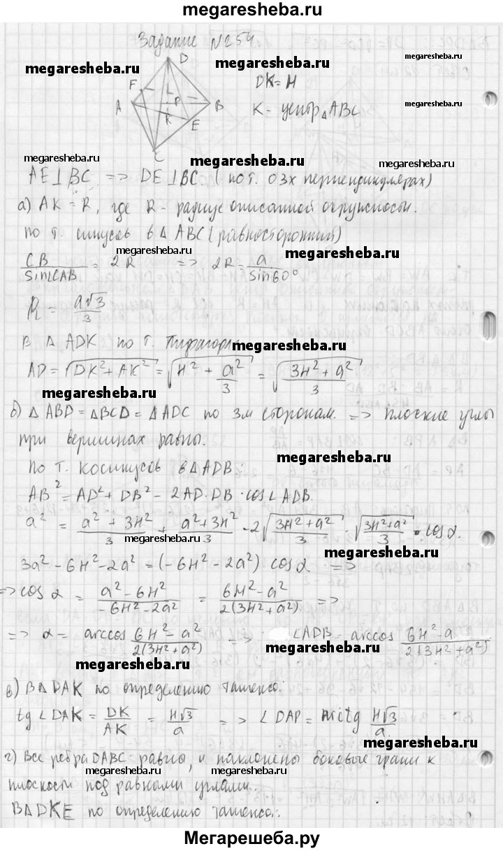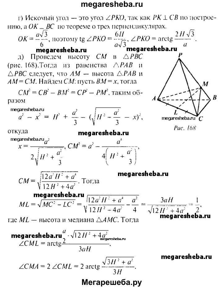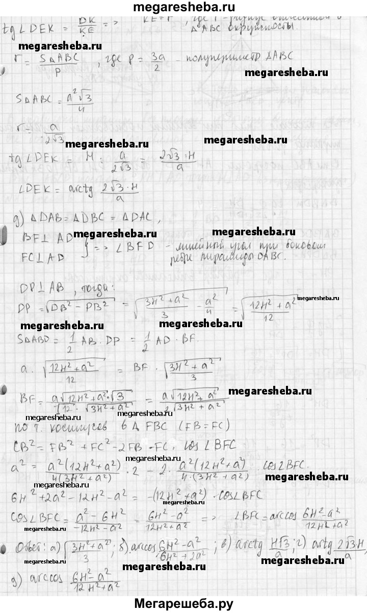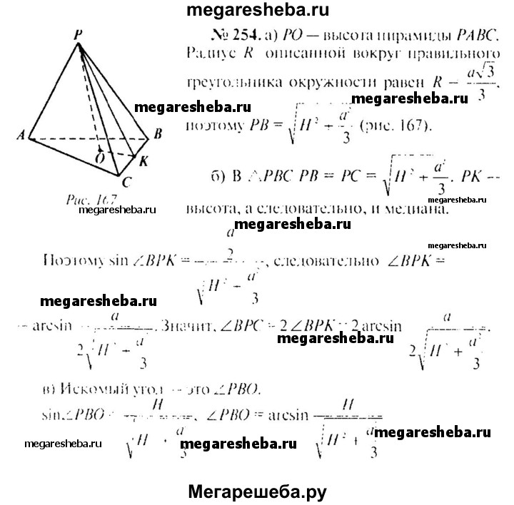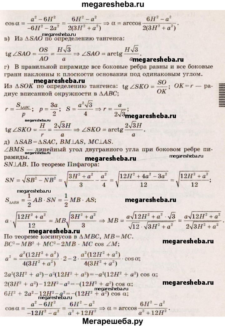 254. В правильной треугольной пирамиде сторона основания равна а, высота равна Н. Найдите: а) боковое ребро пирамиды; б) плоский угол при вершине пирамиды; в) угол между боковым ребром и плоскостью основания пирамиды; г) угол между боковой гранью и основанием пирамиды; д) двугранный угол при боковом ребре пирамиды.