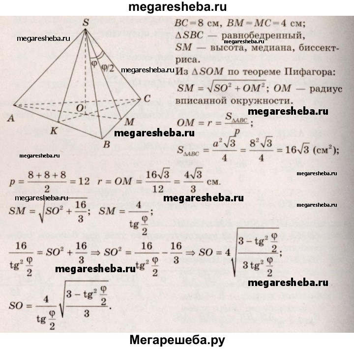 255. В правильной треугольной пирамиде сторона основания равна 8 см, а плоский угол при вершине равен ф. Найдите высоту этой пирамиды.