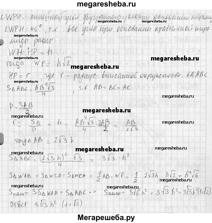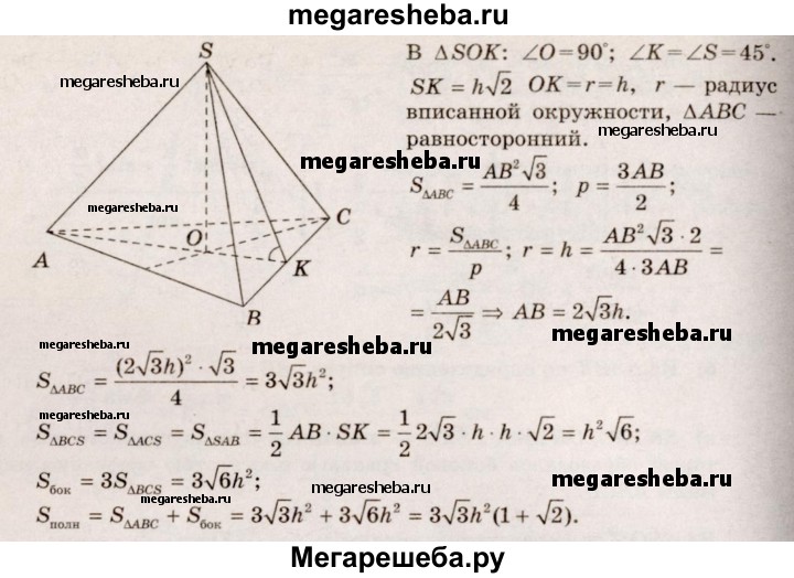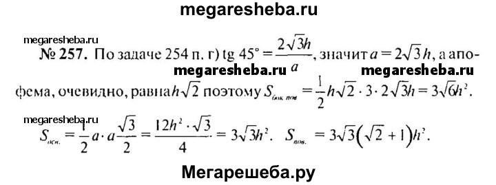257. Высота правильной треугольной пирамиды равна h, а двугранный угол при стороне основания равен 45°. Найдите площадь поверхности пирамиды.