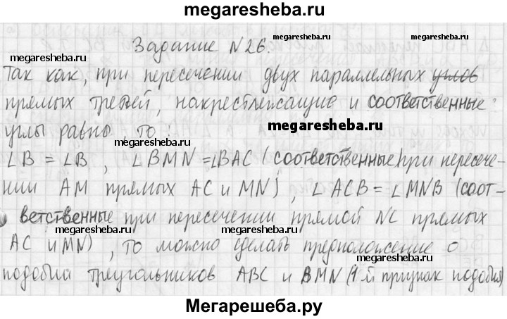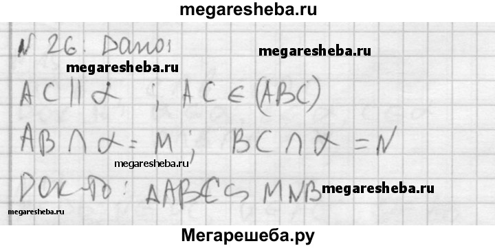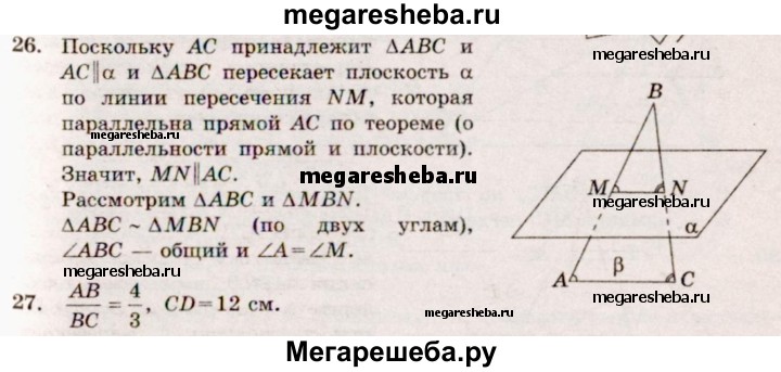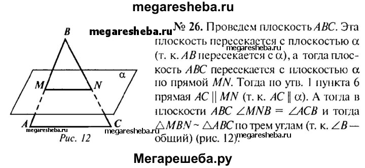 26. Сторона АС треугольника ABC параллельна плоскости α, а стороны АВ и ВС пересекаются с этой плоскостью в точках М и N. Докажите, что треугольники ABC и MBN подобны.
