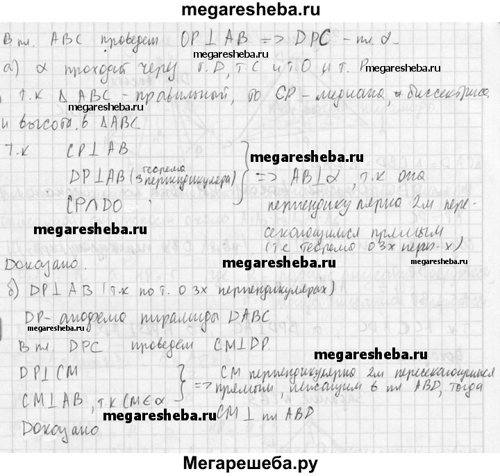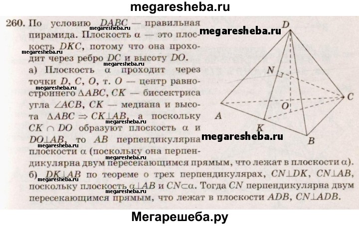 260. В правильной треугольной пирамиде DABC через боковое ребро DC и высоту DO пирамиды проведена плоскость α. Докажите, что: а) ребро АВ перпендикулярно к плоскости α; б) перпендикуляр, проведенный из вершины С к апофеме грани ADB, является перпендикуляром к плоскости ADB.