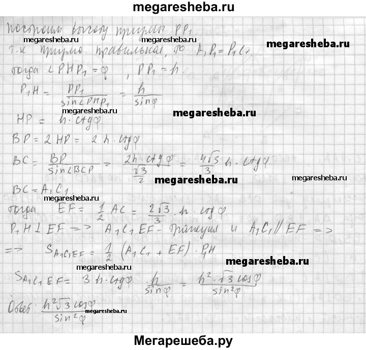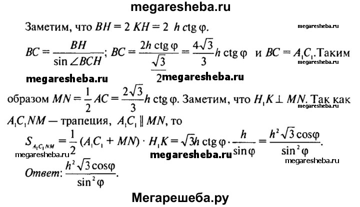 296. Высота правильной треугольной призмы равна h. Плоскость α, проведенная через среднюю линию нижнего основания и параллельную ей сторону верхнего основания, составляет с плоскостью нижнего основания острый двугранный угол ф. Найдите площадь сечения призмы плоскостью α.