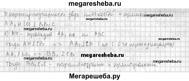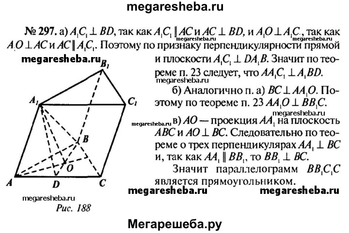 297. Основанием треугольной призмы АВСА₁В₁С₁ является правильный треугольник ABC, BD — высота этого треугольника, а вершина A₁ проектируется в его центр. Докажите, что: a) A₁BD перпендикулярна AА₁C₁', б) АА₁О перпендикулярна ВВ₁С; в) грань BB₁C₁C — прямоугольник.