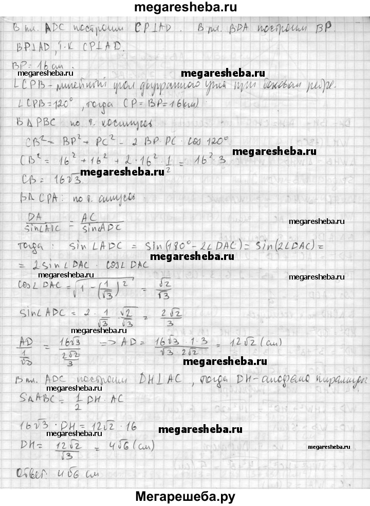 301. Двугранный угол при боковом ребре правильной треугольной пирамиды DABC равен 120°. Расстояние от вершины В до бокового ребра DA равно 16 см. Найдите апофему пирамиды.