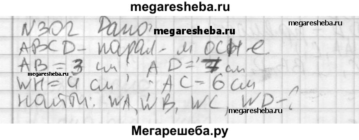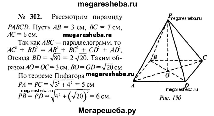 302. Основанием пирамиды является параллелограмм со сторонами 3 см и 7 см и одной из диагоналей 6 см. Высота пирамиды проходит через точку пересечения диагоналей основания и равна 4 см. Найдите боковые ребра пирамиды.