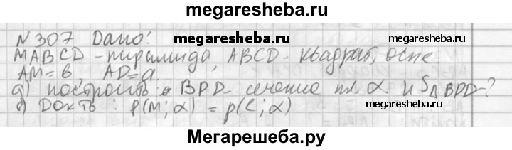 307. В правильной пирамиде MABCD AM = b, AD = а. а) Постройте сечение пирамиды плоскостью α , проходящей через диагональ BD основания параллельно ребру МА, и найдите площадь сечения, б) Докажите, что точки М и С равноудалены от плоскости α.