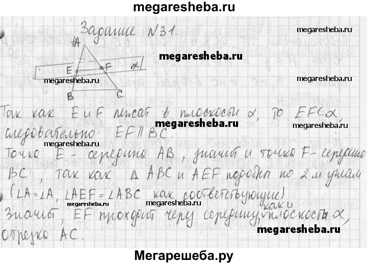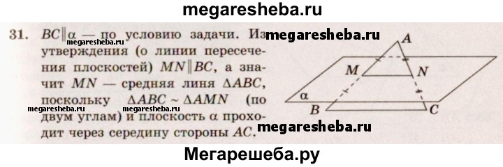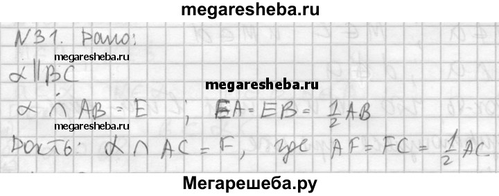 31. Плоскость α параллельна стороне ВС треугольника ABC и проходит через середину стороны АВ. Докажите, что плоскость а проходит также через середину стороны АС.