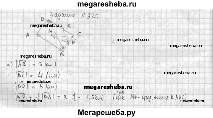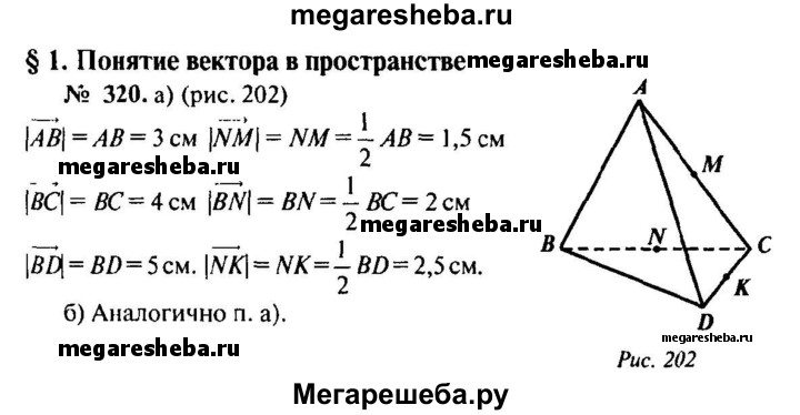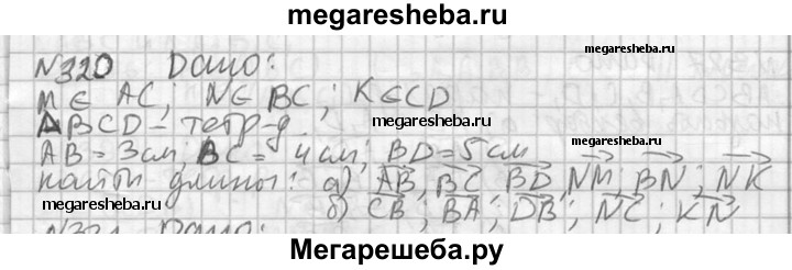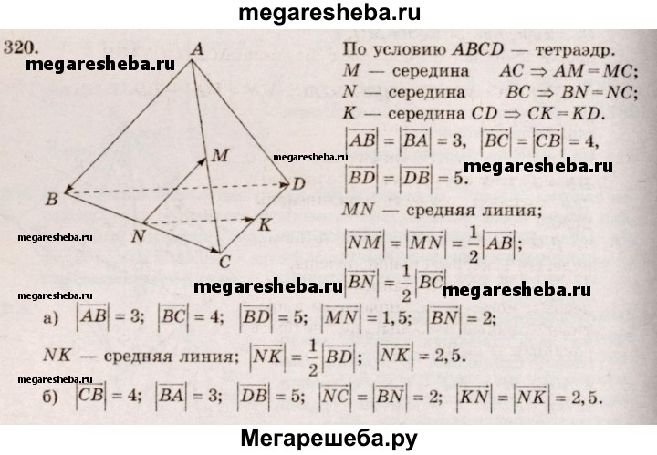 320. В тетраэдре ABCD точки М, N и К — середины ребер АС, ВС и CD соответственно, АВ = 3 см, ВС = 4 см, BD = 5 см. Найдите длины векторов: а) АВ, ВС, BD, NM, BN, NK; б) СВ, ВА, DB, NC, KN.
