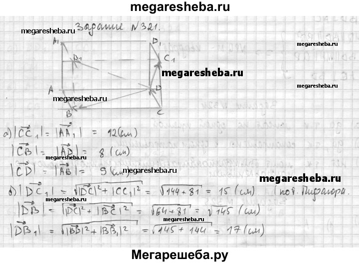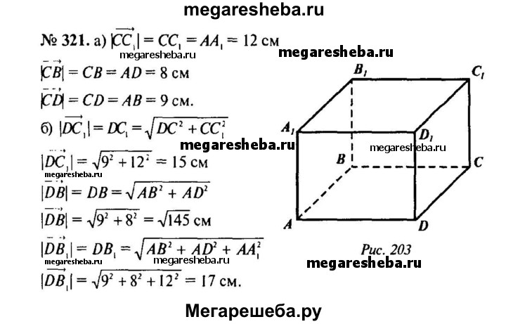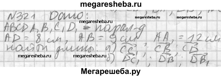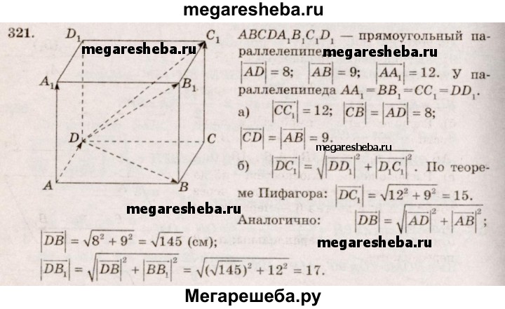 321. Измерения прямоугольного параллелепипеда ABCDA₁B₁C₁D₁ имеют длины: AD = 8 см, АВ = 9 см и АА₁ = 12 см. Найдите длины векторов: а) СС₁, СВ, CD; б)DC₁, DB, DB₁.