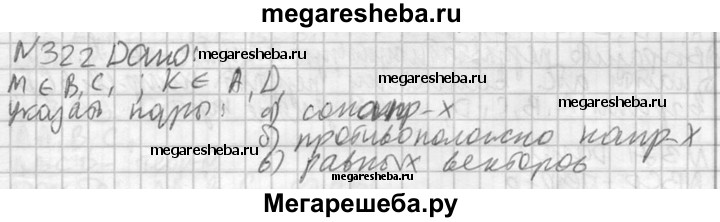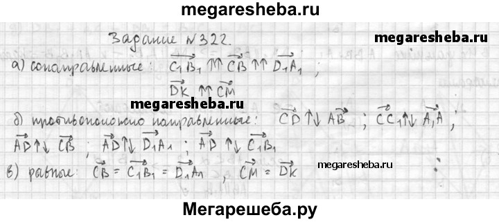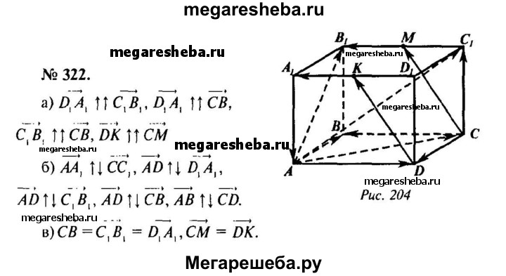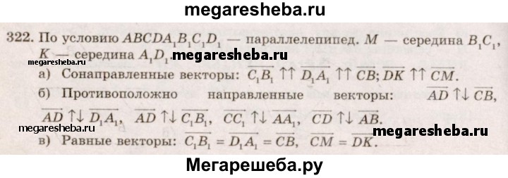 322. На рисунке 104 изображен параллелепипед ABCDA₁B₁C₁D₁. Точки М и К — середины ребер В₁С₁ и A₁D₁. Укажите на этом рисунке все пары: а) сонаправленных векторов; б) противоположно направленных векторов; в) равных векторов.