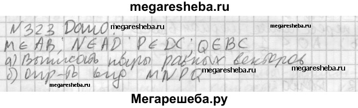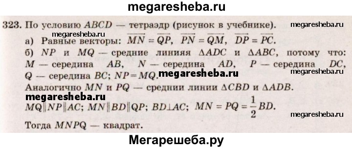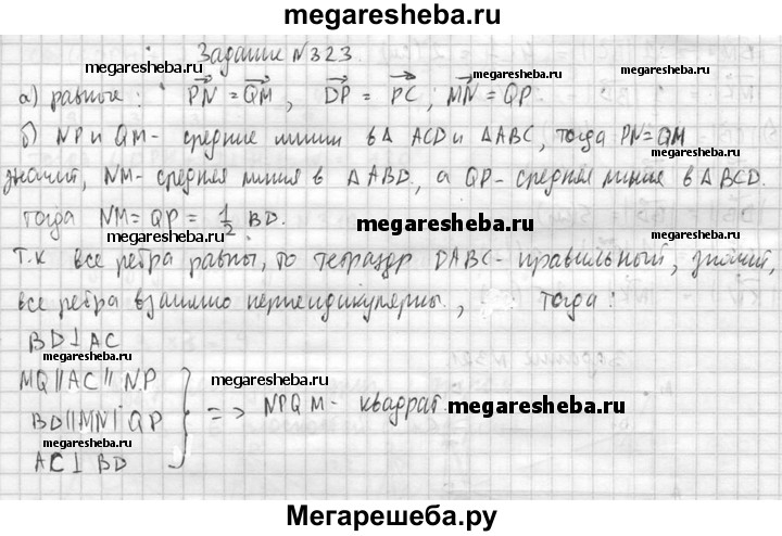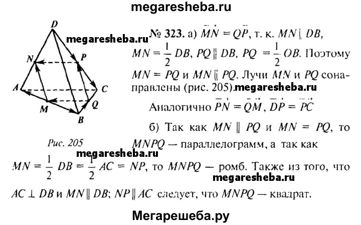 323. На рисунке 105 изображен тетраэдр ABCD, ребра которого равны. Точки М, N, Р и Q — середины сторон АВ, AD, DC, ВС. а) Выпишите все пары равных векторов, изображенных на этом рисунке, б) Определите вид четырехугольника MNPQ.