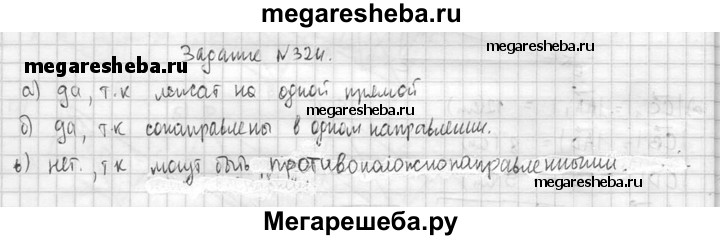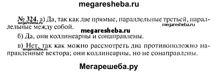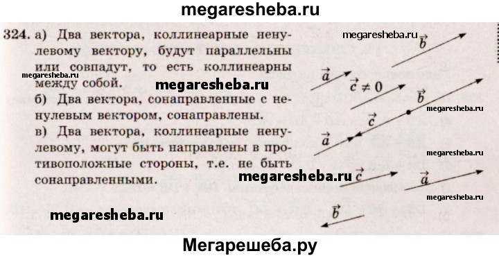 324. Справедливо ли утверждение: а) два вектора, коллинеарные ненулевому вектору, коллинеарны между собой; б) два вектора, сонаправленные с ненулевым вектором, сонаправлены; в) два вектора, коллинеарные ненулевому вектору, сонаправлены?