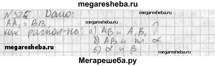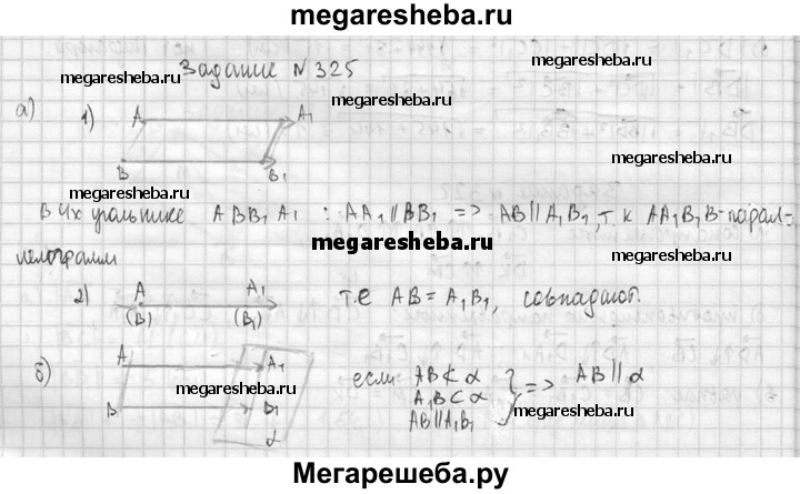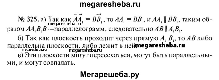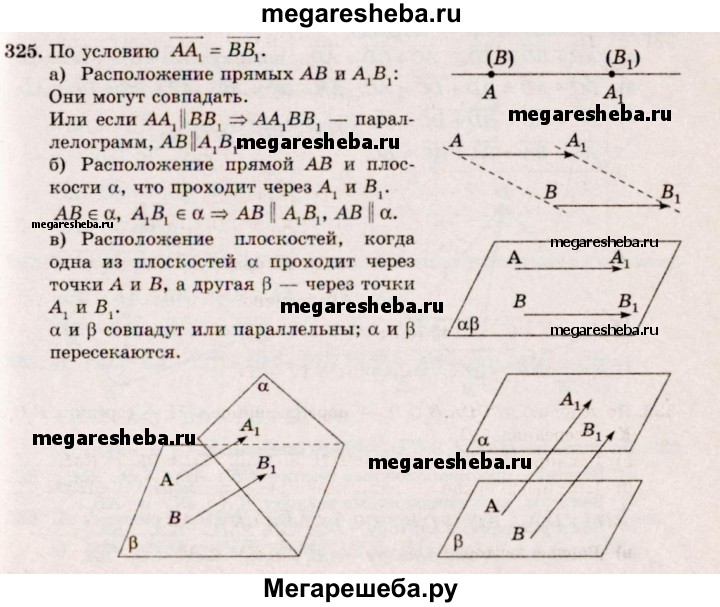 325. Известно, что вектор АА₁ = вектору ВВ₁. Как расположены по отношению друг к другу: а) прямые АВ и А₁В₁; б) прямая АВ и плоскость, проходящая через точки А₁ и В₁; в) плоскости, одна из которых проходит через точки А и В, а другая проходит через точки А₁ и В₁.