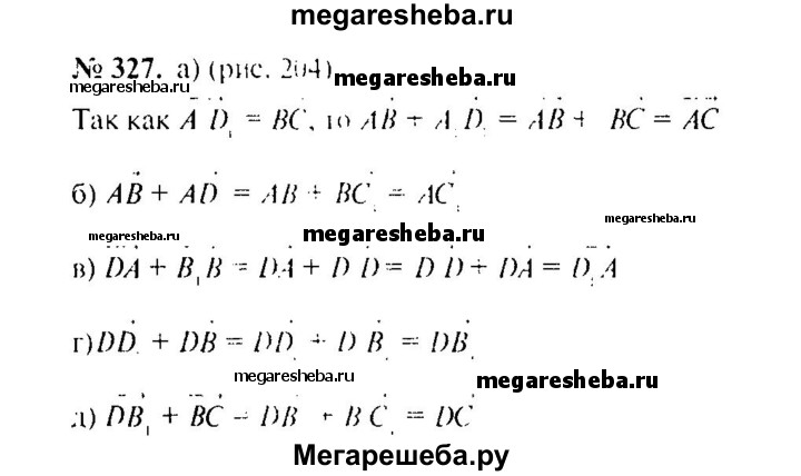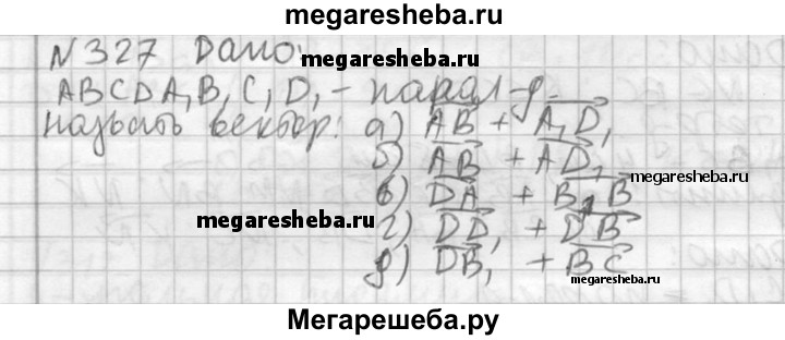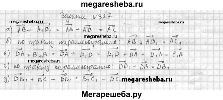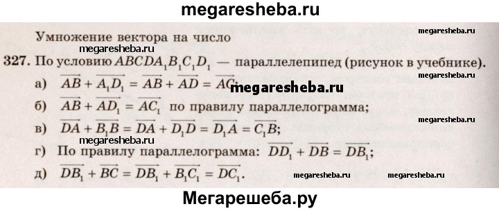 327. На рисунке 104 изображен параллелепипед ABCDA₁B₁C₁D₁. Назовите вектор, начало и конец которого являются вершинами параллелепипеда, равный сумме векторов: a) вектор АВ + вектор А₁D₁; б) вектор AB + вектор AD₁; в) вектор DA + вектор В₁В; г) вектор DD₁ + вектор DB; д) вектор DB₁ + вектор ВС.