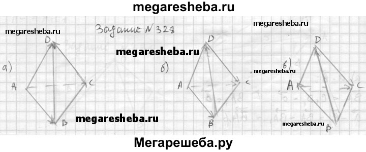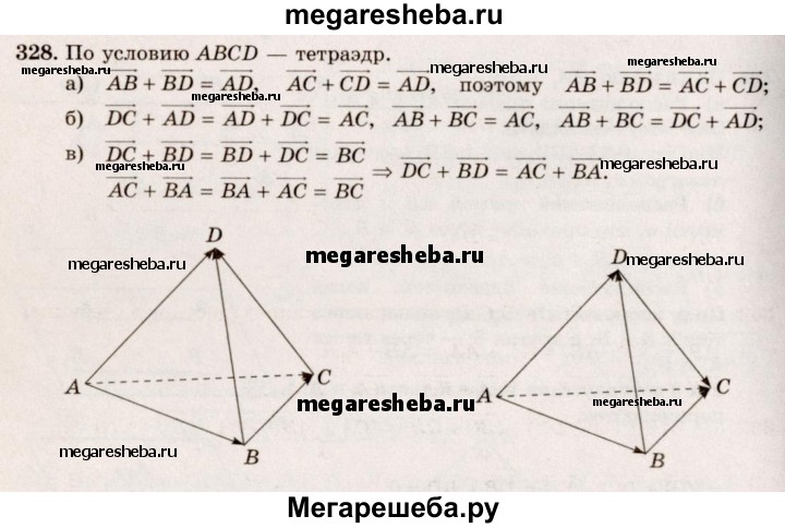 328. Дан тетраэдр ABCD. Докажите, что: а) вектор АВ + вектор BD= вектор AC + вектор CD; б) вектор АВ + вектор ВС = вектор DC + вектор AD; в) вектор DC + вектор BD = вектор AC + вектор ВА.