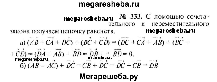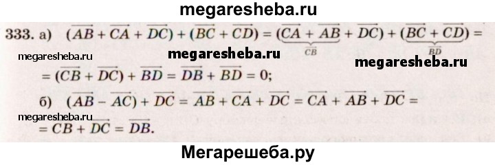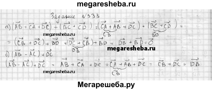 333. В пространстве даны четыре точки А, В, С и D. Назовите вектор с началом и концом в данных точках, равный сумме векторов: а) (вектор АВ + вектор СА + вектор DC) + (вектор ВС + вектор CD); б) (вектор АВ - вектор АС) + вектор DC.