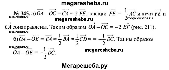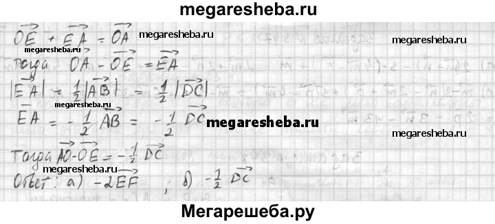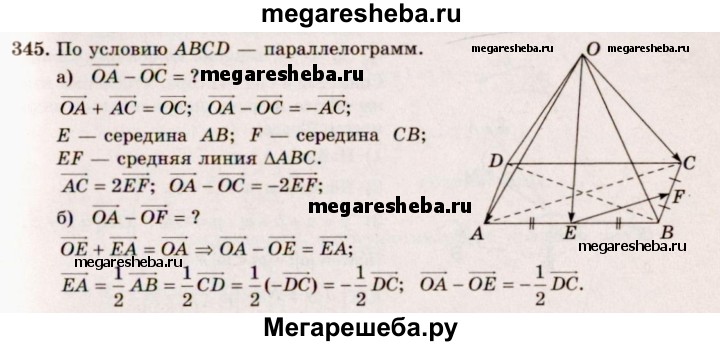 345. Точки Е и F — середины оснований АВ и ВС параллелограмма ABCD, а О — произвольная точка пространства. Выразите: а) вектор OA - вектор ОС через вектор ЕЕ; б) вектор OA - вектор ОЕ через вектор DC.