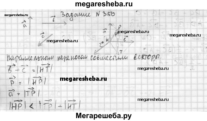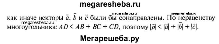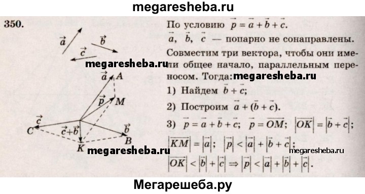 350. Известно, что вектор p = вектор а + вектор b + вектор с, причем векторы a, b и с попарно не сонаправлены. Докажите, что |p|<|a|+|b|+|c|.