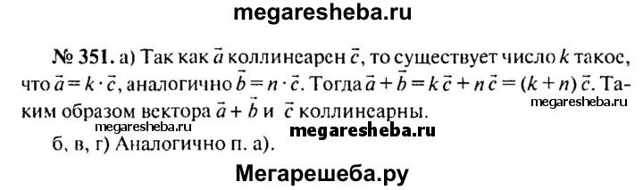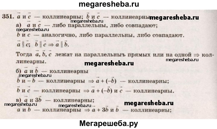 351. Векторы а и с, а также b и с коллинеарны. Докажите, что коллинеарны векторы: а) вектор а + вектор b и вектор с; б) вектор а - вектор b и вектор с; в) вектор а + З вектора b и вектор с; г) - вектор а + 2 вектора b и вектор с.