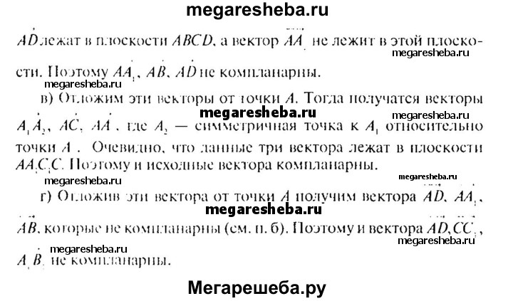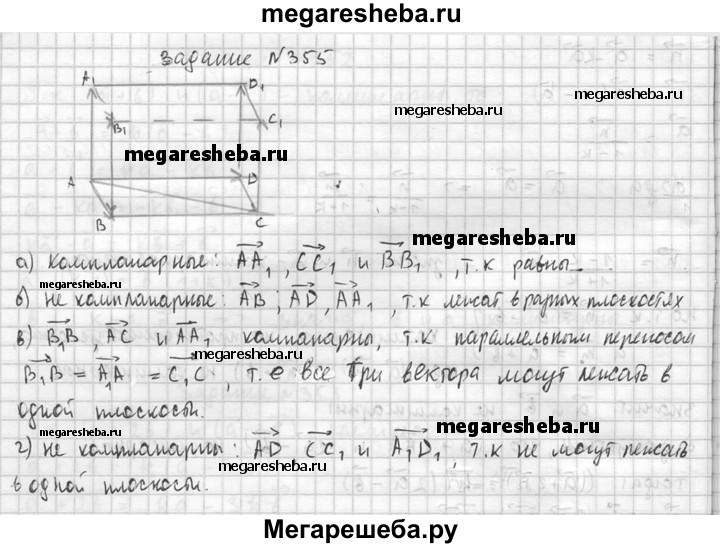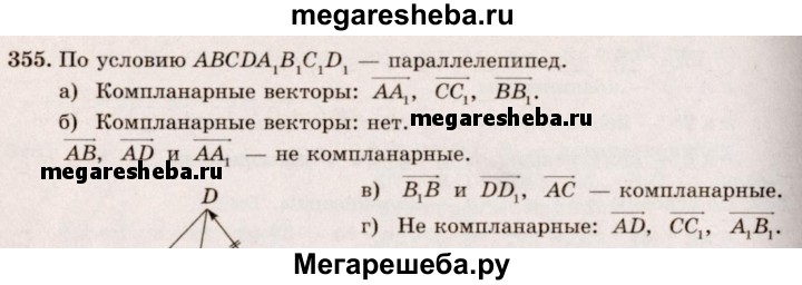 355. Дан параллелепипед ABCDA₁B₁C₁D₁. Какие из следующих трех векторов компланарны: а)вектор АА₁, вектор СС₁, вектор ВВ₁; б) вектор АВ, вектор AD, вектор AA₁; в) вектор В₁В, вектор AC, вектор DD₁; г) вектор АD, вектор СС₁, вектор A₁B₁?