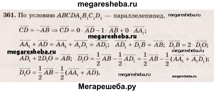 361. Диагонали параллелепипеда ABCDA₁B₁C₁D₁ пересекаются в точке О. Разложите векторы CD и D1O по векторам АА₁, АВ и AD.