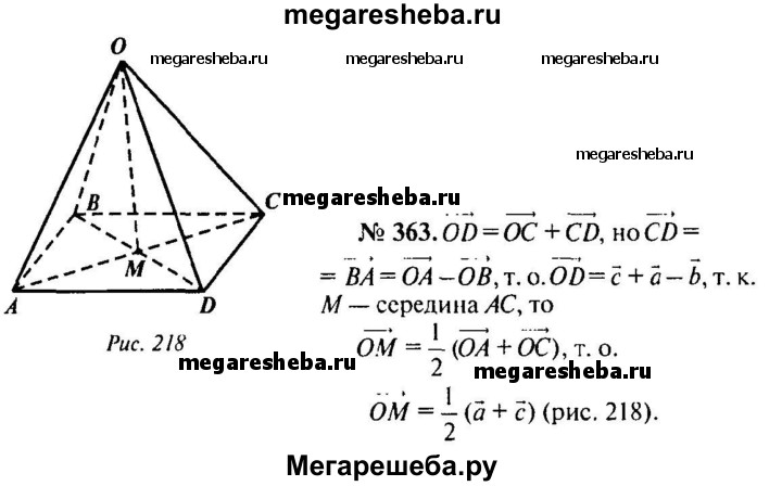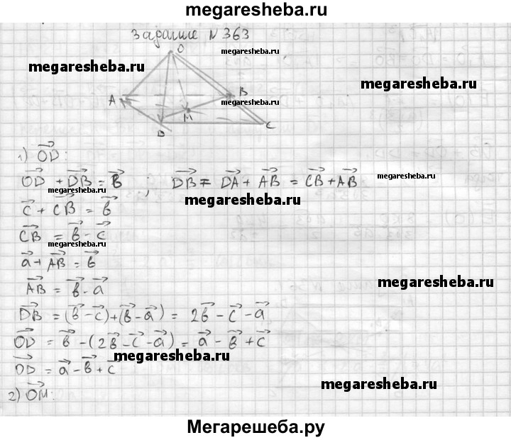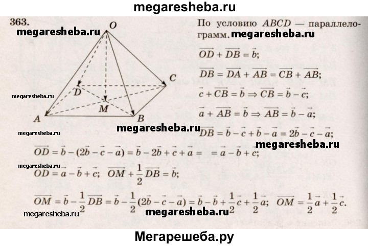 363. Основанием пирамиды с вершиной О является параллелограмм ABCD, диагонали которого пересекаются в точке М. Разложите векторы OD и ОМ по векторам а = OA, b = OB и с = ОС.