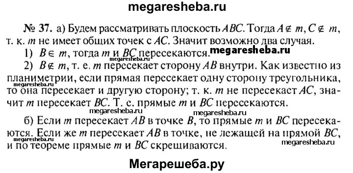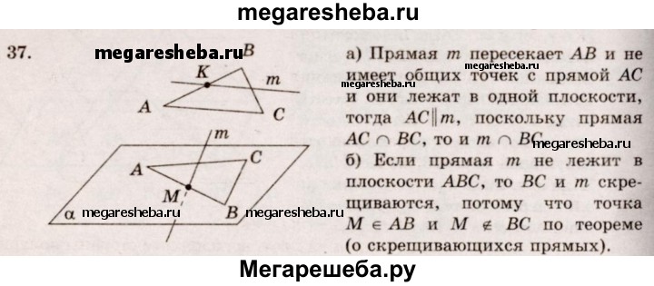 37. Прямая m пересекает сторону АВ треугольника ABC. Каково взаимное расположение прямых m и ВС, если: а) прямая m лежит в плоскости ABC и не имеет общих точек с отрезком АС; б) прямая m не лежит в плоскости ABC?
