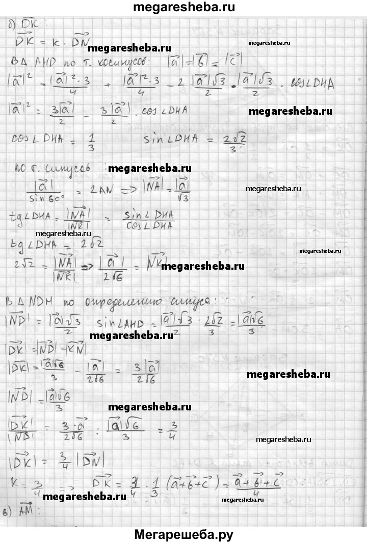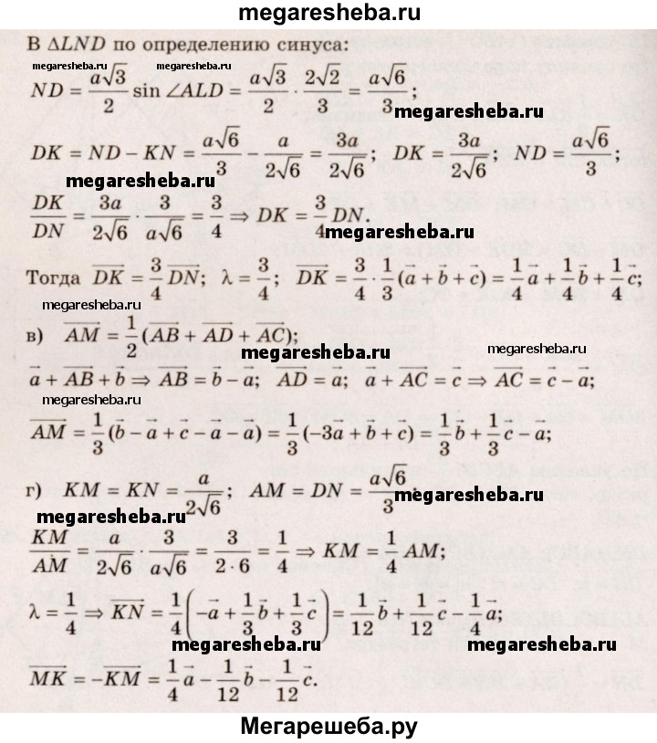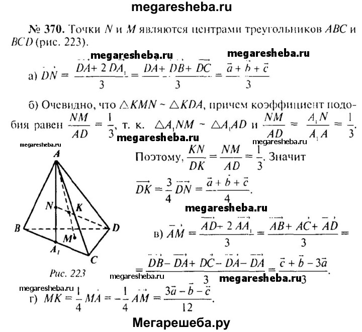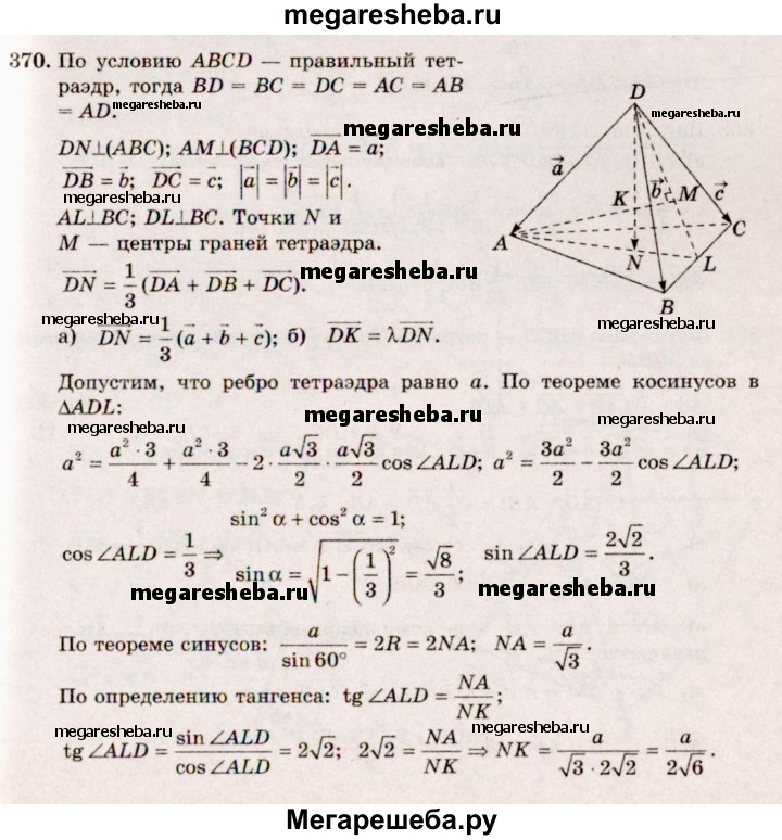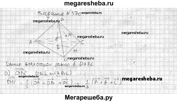 370. Высоты AM и DN правильного тетраэдра ABCD пересекаются в точке К. Разложите по векторам а = DA, b = DB, с =DC вектор: a) вектор DN; б) вектор DK; в) вектор AM; г) вектор МК.