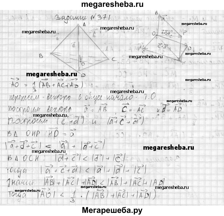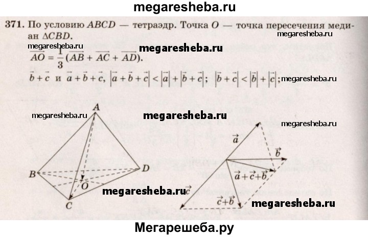 371. В тетраэдре ABCD медианы грани BCD пересекаются в точке О. Докажите, что длина отрезка АО меньше одной трети суммы длин ребер с общей вершиной А.