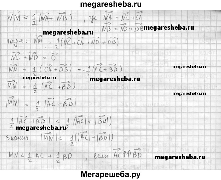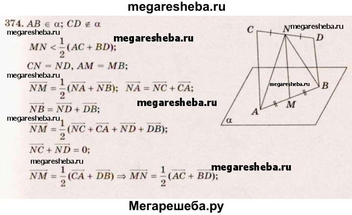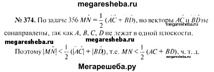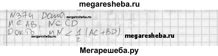 374. Отрезки АВ и CD не лежат в одной плоскости, точки М и N — середины этих отрезков. Докажите, что MN < 1/2 (АС + BD).