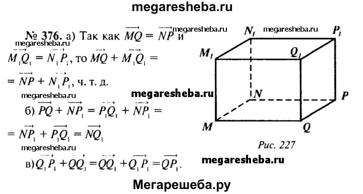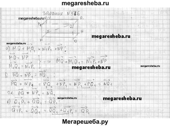 376. Дан параллелепипед MNPQM₁N₁P₁Q₁. Докажите, что: a) вектор MQ + вектор M₁Q₁= вектор N₁P₁ + вектор NP; б) вектор PQ + вектор NP₁ = вектор NQ₁; в) вектор Q₁P₁ + вектор QQ₁= вектор QP₁