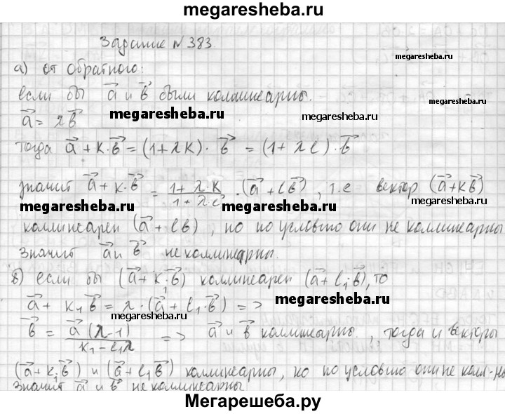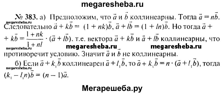 383. Числа k и I не равны друг другу. Докажите, что если векторы а + kb и а + lb не коллинеарны, то: а) векторы а и b не коллинеарны; б)векторы а + k₁b и а + I₁b не коллинеарны при любых неравных числах k₁ и l₁.