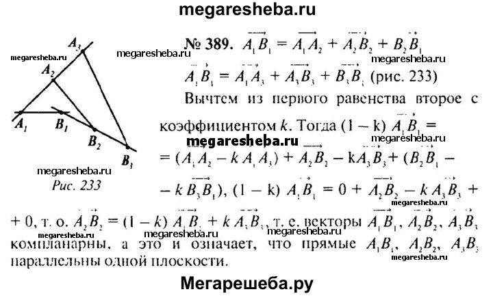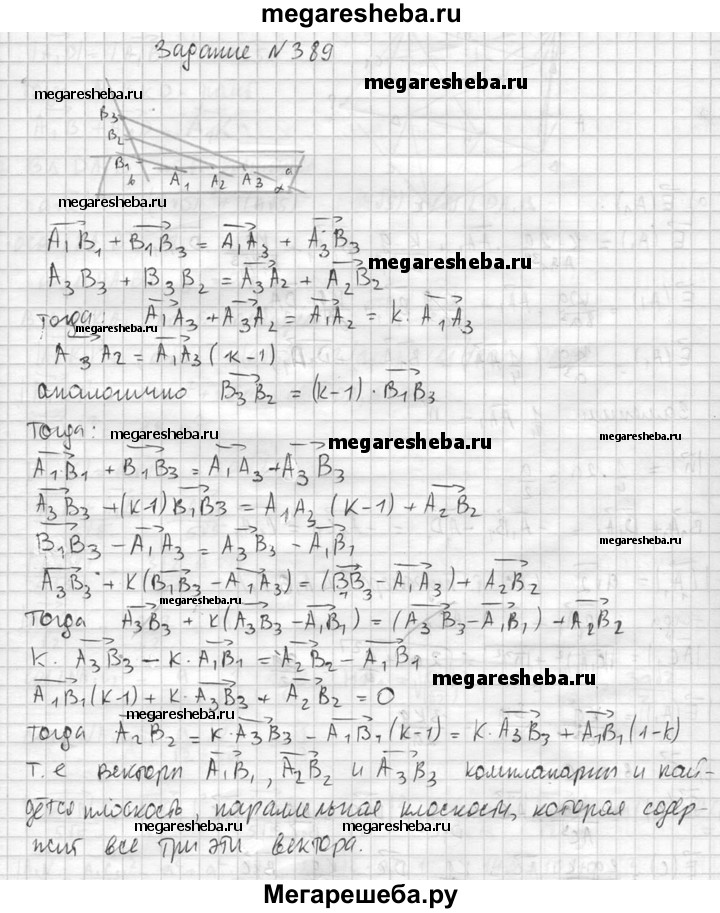 389. На двух скрещивающихся прямых отмечены по три точки: А₁, А₂, А₃ и В₁, В₂, В₃, причем вектор А₁А₂ = k • вектор A₁A₃, вектор В₁В₂ =k • вектор В₁В₃. Докажите, что прямые А₁В₁, А₂В₂, А₃В₃ параллельны некоторой плоскости.